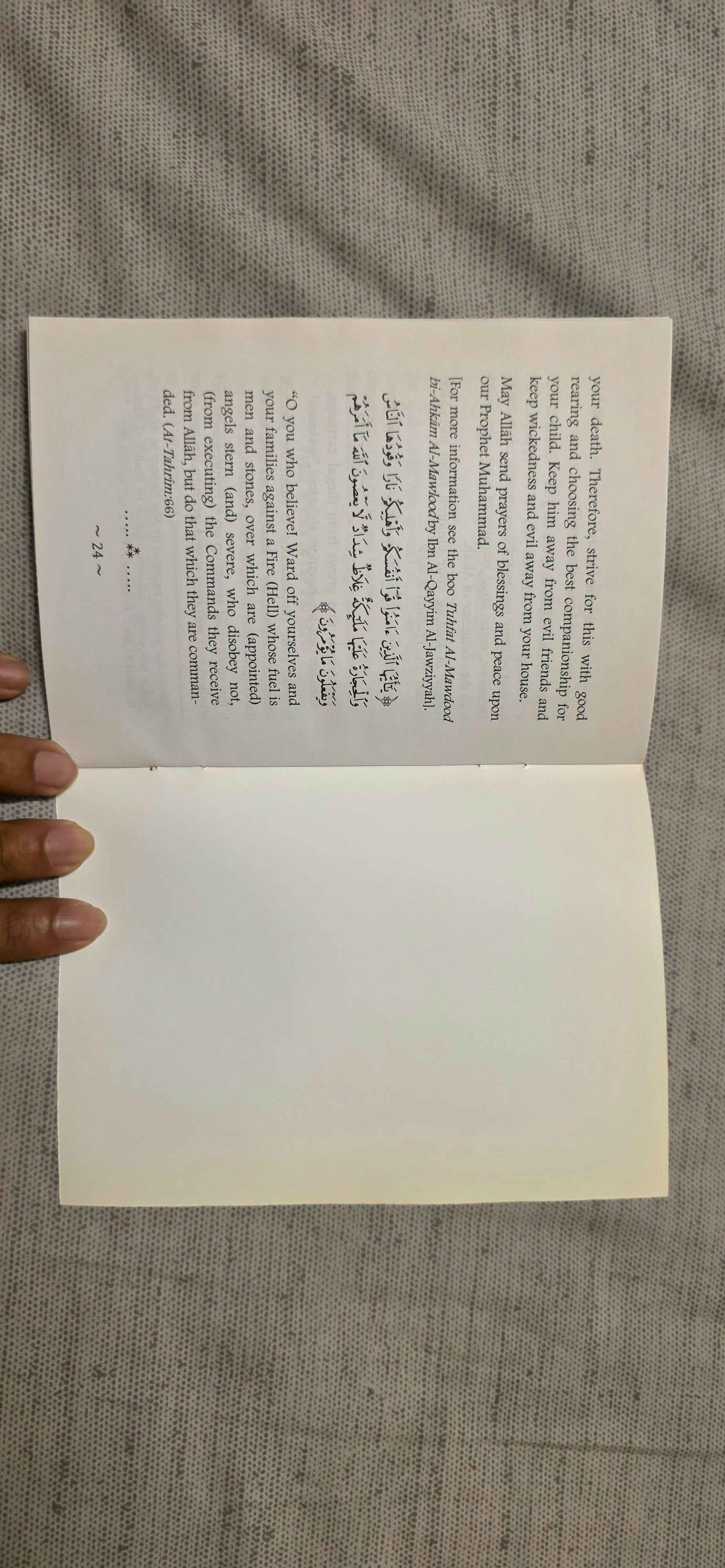 "Islamic Etiquettes for a Newborn Child" is a nice booklet prepared by the Darussalam Research Division. It highlights, from the Sunnah of the Prophet Muhammad (peace be upon him), the precise etiquettes that we should be instilling in our newborn children. It is a must-read book if you are newly married or expecting a child. Every claim made in this book is supported by authentic hadiths and verses from the Noble Quran. It also has details of names that are prohibited to be used for Muslim children and names that are disliked according to Islamic law.