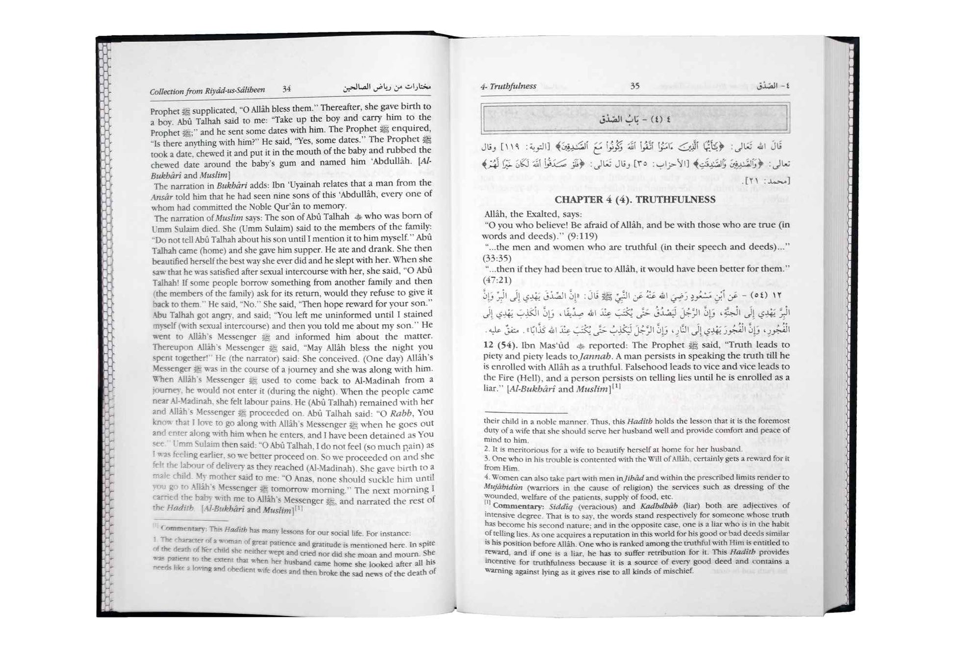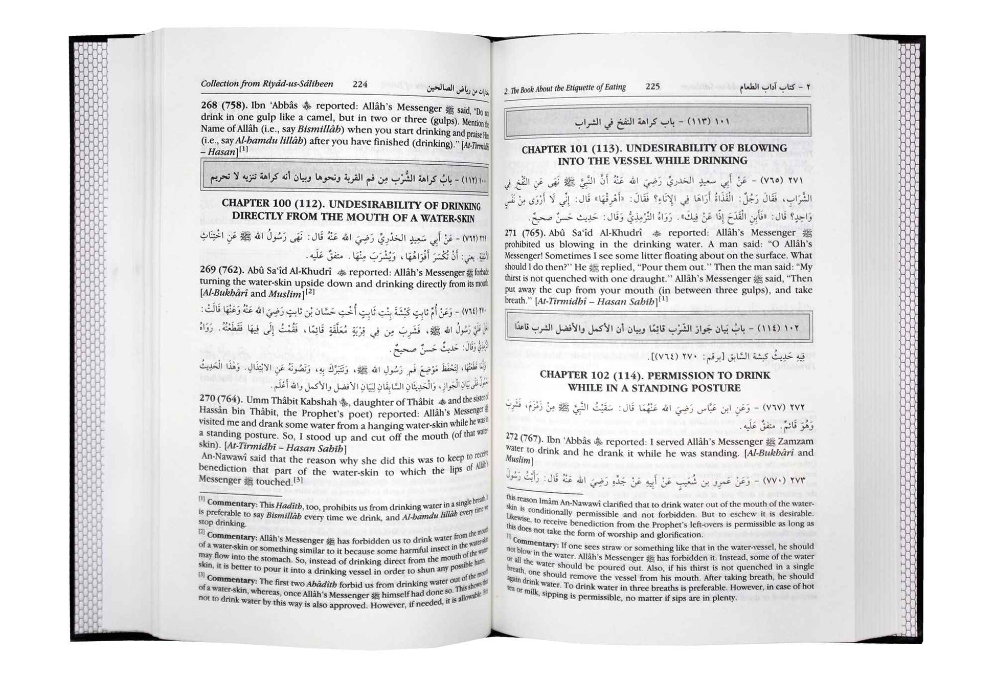 Riyadus-Saliheen by Darussalam is a collection of hadiths from Al Imam An-Nawawi’s compilation, Riyadus-Saliheen, and features commentary on all hadiths it mentions. The commentary has been done by Hafiz Salahuddin Yusuf. The book gives guidance on various matters such as repentance, patience and perseverance, truthfulness, watchfulness, piety, reliance on Allah, struggle, moderation in worship, intercession, fear, hope, parents, husband rights, women rights, miserliness, death, manners, etiquette of eating, dressing, salutations, visiting the sick, travelling, virtues, prohibited actions, and forgiveness. The book is in the English language and features Arabic text of Hadiths.